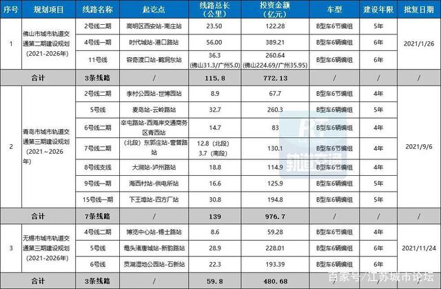 從2021年國家發改委批復來看,青島市獲批線路及總投資金額最高,共計有7條城軌項目,線路總長139公里,批復金額976.7億。