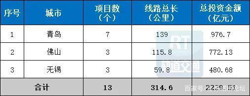其次是佛山市,3項城軌建設項目,總長115.8公里,總投資金額772.13億元。