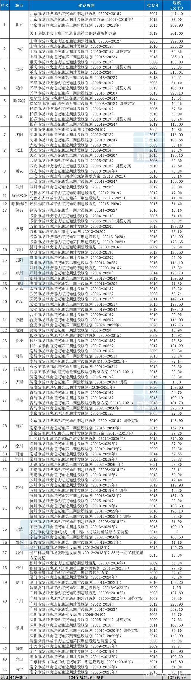 2005年-2020年,中國各城市軌道交通規劃建設獲批項目共計124個,獲批里程12799.79公里,涉及44座城市。