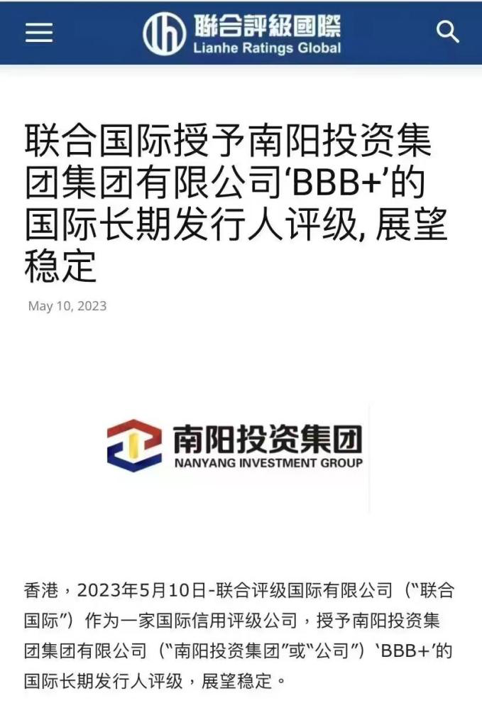 5月10日,經聯合評級國際有限公司評定:授予南陽投資集團有限公司“BBB+”的國際長期發行人評級,展望穩定。