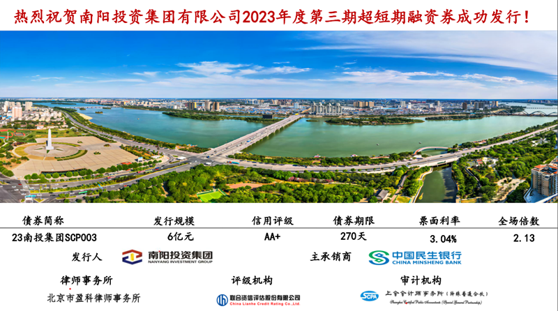 第三期超短期融資券(23南投集團SCP003)的成功發(fā)行,彰顯了南陽省域副中心城市的地位,更彰顯了南陽市委市政府的卓越領(lǐng)導,更是全市上下奮力拼搏譜新篇的最真實寫照。南陽投資集團作為南陽地區(qū)最大最強的國企,在本次發(fā)行工作中展現(xiàn)出強大的企業(yè)綜合實力和市場影響力,進一步加強了全國范圍內(nèi)市場化投資人對南陽區(qū)域和南陽投資集團的了解,集團憑借本次在資本市場上持續(xù)的強力表現(xiàn),繼續(xù)穩(wěn)居“強AA+”行列,為今后拿下AAA評級進一步打下堅實基礎(chǔ)。