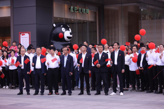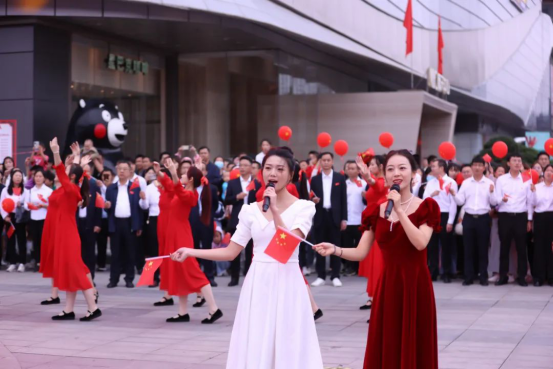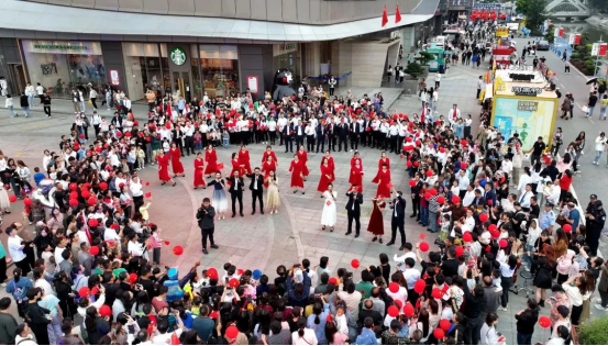 10月1日,南陽市宛城區(qū)建設(shè)路與人民路交叉口的360廣場摩根店,一派節(jié)日繁華。隨著歌曲《我和我的祖國》經(jīng)典旋律響起,現(xiàn)場的群眾手舉國旗、載歌載舞,用嘹亮的歌聲和幸福的舞蹈來表白他們對祖國的節(jié)日祝福。