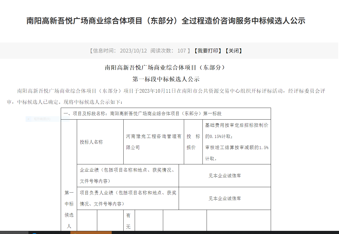 近日,南陽市建設(shè)投資有限公司下屬子公司河南豫宛工程咨詢管理有限公司成功中標(biāo)南陽高新吾悅廣場商業(yè)綜合體項目(東部分)全過程造價咨詢服務(wù)。