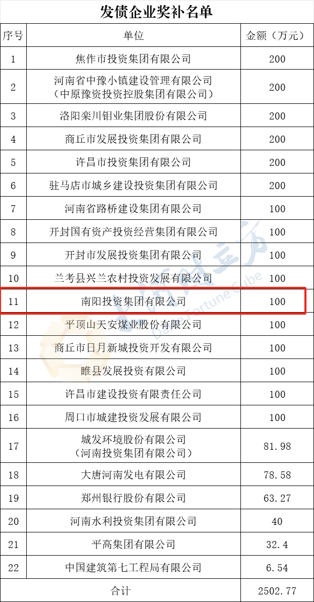 近日,河南省財政廳、河南省地方金融監督管理局依據《河南省金融業發展專項獎補資金管理辦法》發布了關于撥付2022年度金融業發展專項獎補資金的通知,南陽投資集團因在債券市場的出色表現,獲得省財政廳獎勵的100萬元發債獎補資金。