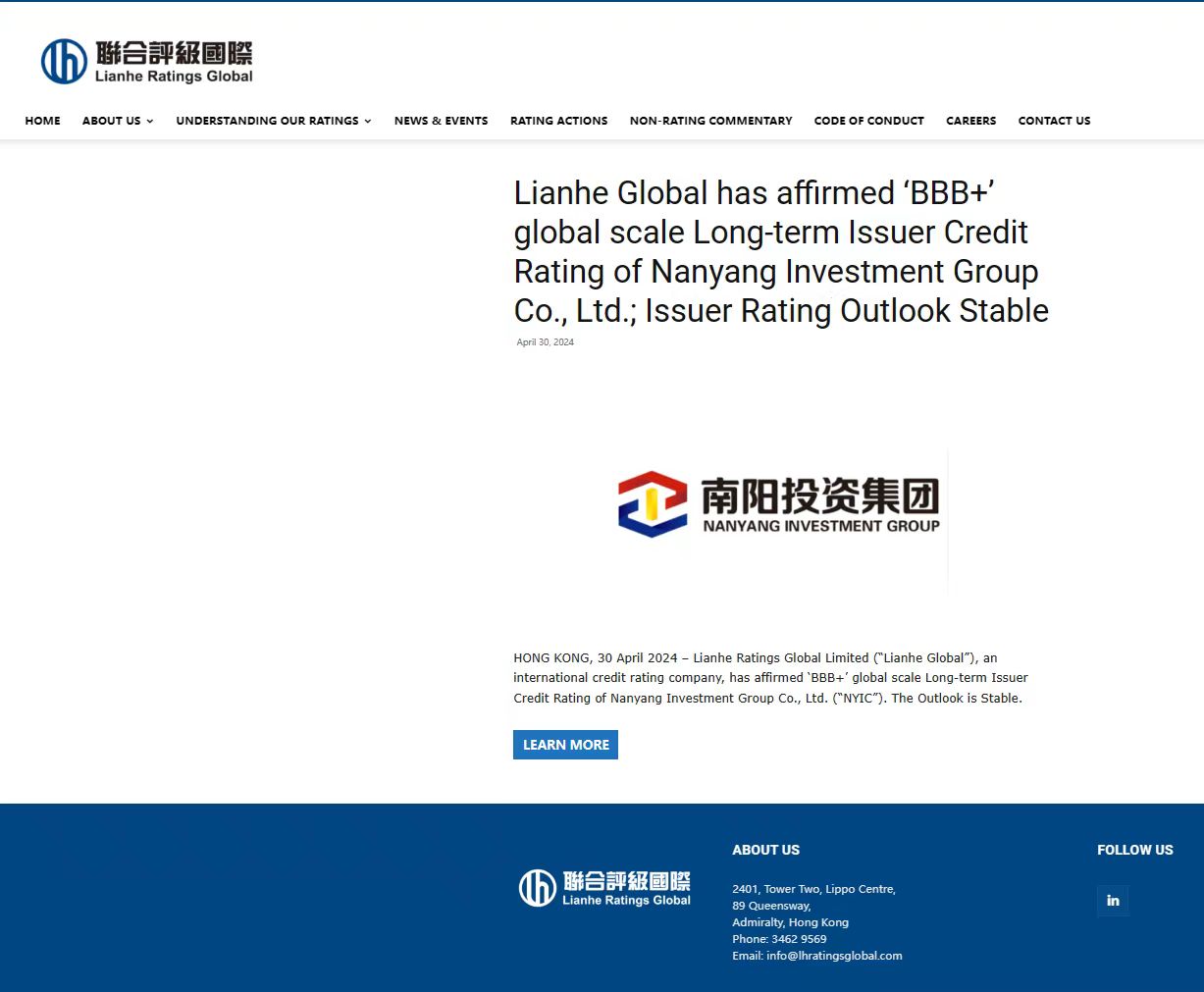 2024年4月30日,經聯合國際評級有限公司評定:授予南陽投資集團有限公司“BBB+”的國際長期發行人評級,展望穩定。