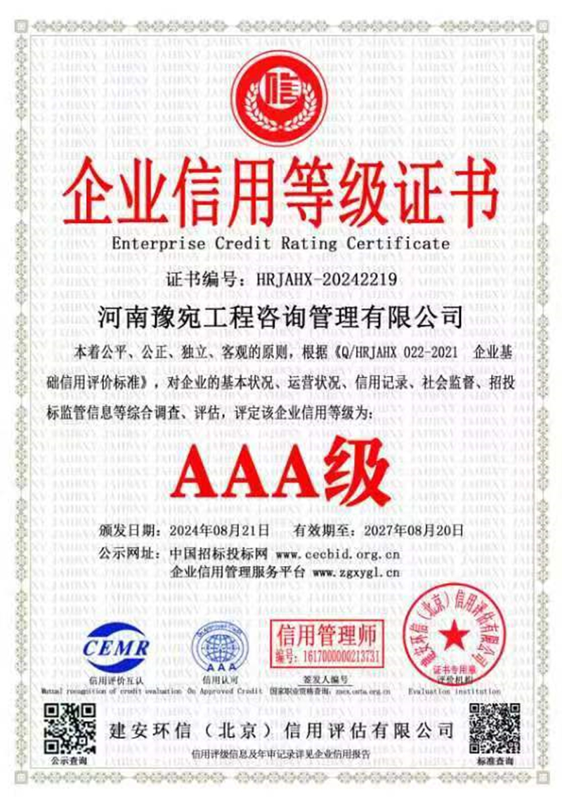 近日,集團下屬河南豫宛工程咨詢管理有限公司(簡稱:豫宛咨詢公司)順利通過中部國際認證有限公司三大“ISO管理體系”認證和建安環信(北京)信用評估有限公司“AAA級企業信用等級”評定并獲得相關認證證書,這是豫宛咨詢公司管理邁向規范化、標準化、科學化,與國際標準接軌的重要一步,標志著公司管理水平邁上新臺階,同時是公司的經營實力和發展前景在國內信用領域得到高度肯定的有力證明。