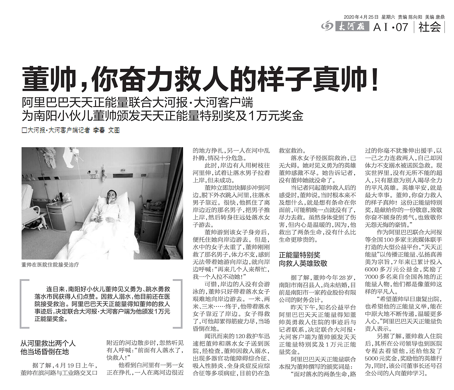 2020年4月19日,濱河路與工業路交叉口附近的河邊一男一女落水,散步路過的董帥不顧個人安危,挺身而出,以一己之力連救兩人,自己卻因體力不支溺水被送醫急救,因多器官功能障礙綜合征、吸入性肺炎、全身炎癥反應綜合征等多項病癥在醫院治療十余日。2021年12月,董帥被臥龍區授予“見義勇為”榮譽稱號。